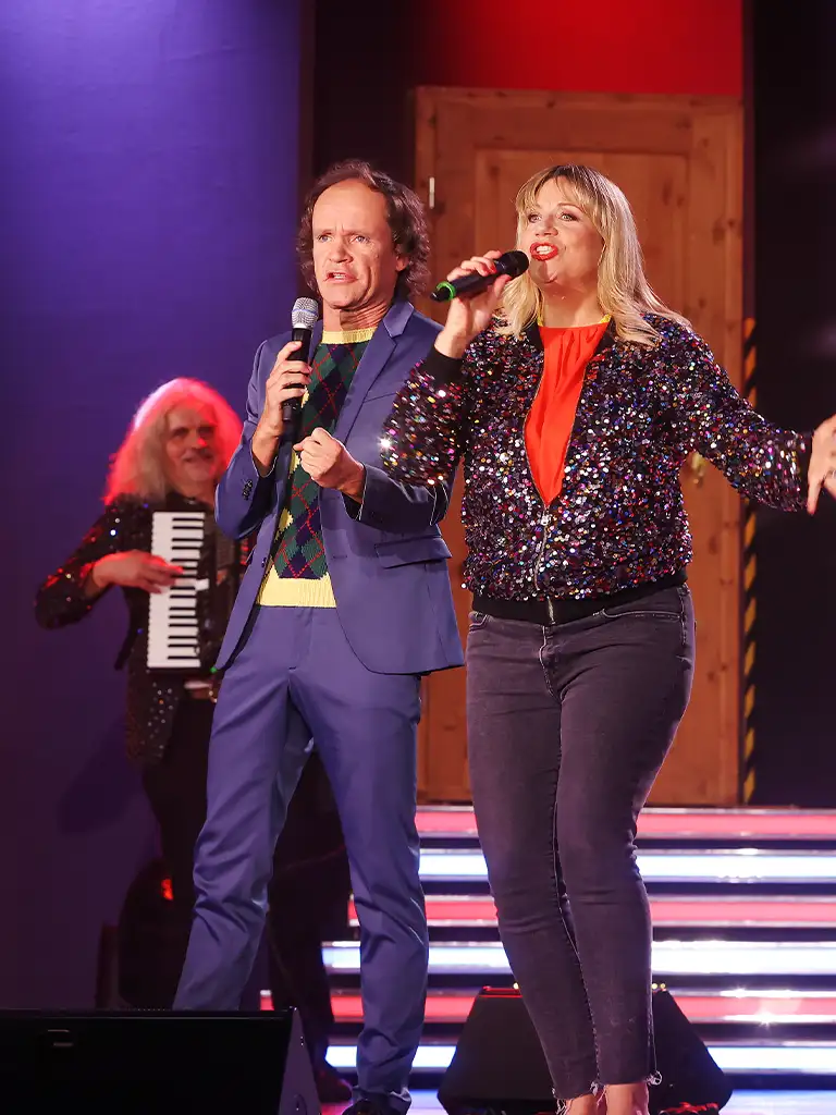 Für Mirja Regensburg erfüllte sich bei der diesjährigen Gala ein langgehegter Traum. Gemeinsam mit dem charismatischen Gastgeber Olaf Schubert und seiner erstklassigen Band präsentierte die Comedienne ihren zweiten Grand-Prix-Hit „Snriska Dirska“ vor einem begeisterten Publikum.